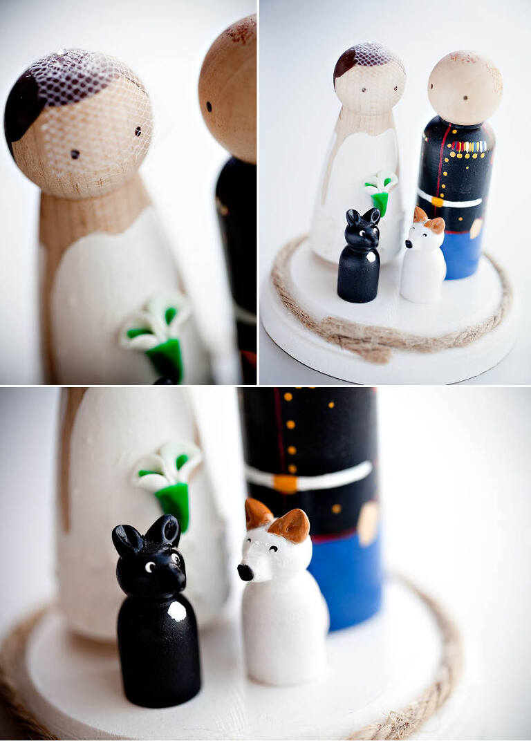 • Custom designed to wedding dress & the addition of Ricky & Lucy included on the cake topper (complete family) by Itty Bitty Woodshop (Etsy)
